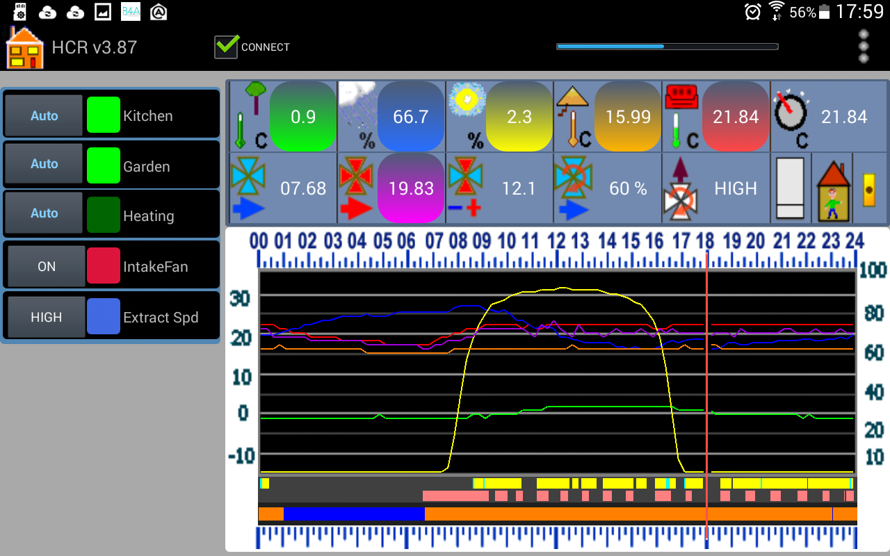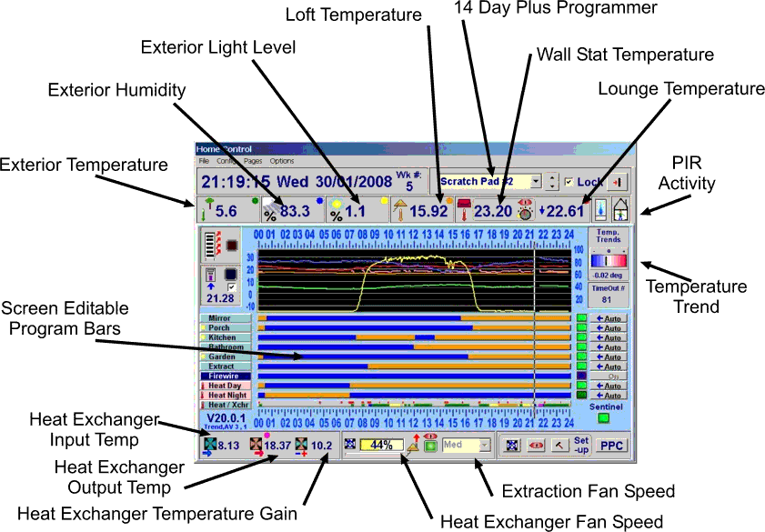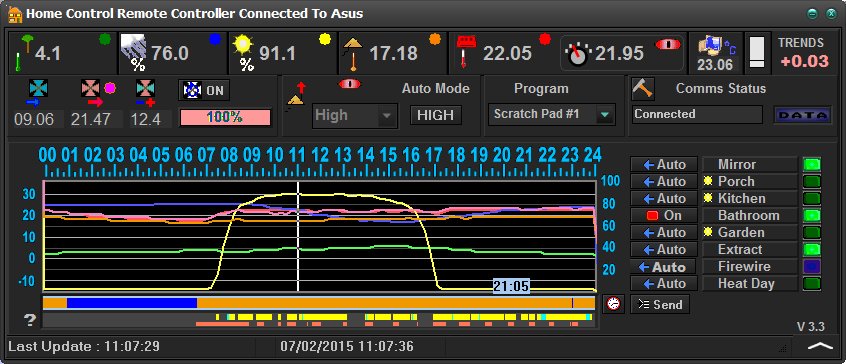 OverviewThe system consists of a computer that controls the central heating system and several other circuits, used for switching lights on and off, controlling a semi Whole House Ventilation System. The computer also has inputs, these monitor room, and outside temperatures, humidity, extraction fan speed in addition outside light levels are monitored, there is spare capacity to add other devices. A WiFi connection allows me to control the system remotely. |